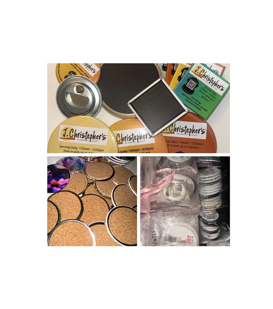 If you are hosting a party, promoting your business or want to give your customers a thank you gift? Our custom magnets, bottle openers, buttons, drink coasters & compact mirrors are perfect for you!